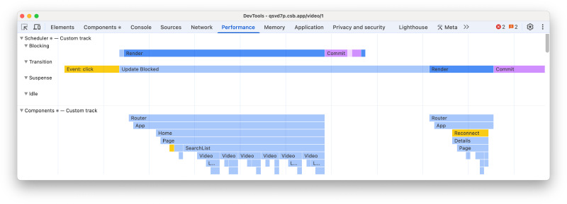 Не обошли стороной и совсем новые фичи – команда React’а ведёт разработку по улучшению DX при работе с DevTools. С недавнего времени во вкладку Performance можно добавлять кастомные треки, что возможно позволит интегрировать React DevTools в браузеры без расширения.